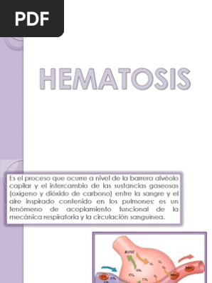 RESUMEN La hematosis es el proceso de intercambio gaseoso que se produce en los capilares sanguíneos de los alvéolos mediante la difusión de gases. Las consecuencias de una falla en este sistema son evidentes trombosis12 o hemorragia 34. La hematosis es el proceso de intercambio gaseoso entre el ambiente exterior y la sangre de un animal cuya finalidad es la fijación de oxígeno O2 y la eliminación de dióxido de carbono CO2durante la respiración1 En todos los organismos se produce por difusión simple es decir a favor del gradiente de presión parcial y sin gasto energético2 Por ello la presión parcial del.