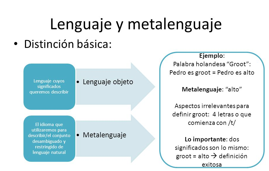 Por ejemplo en la proposición 7. Este último se llama metalenguaje respecto al lenguaje-objeto dado. Lenguaje objeto lenguaje de nivel inferior con respecto al metalenguaje.
